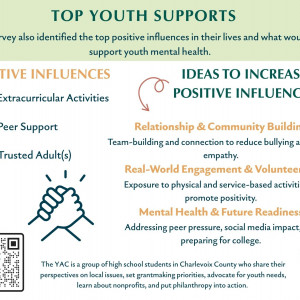 The YN Assessment is conducted every three years and distributed by the YAC to the local school districts. In 2025, the time came to perform a new and updated survey of Charlevoix County youth. This assessment was offered to 7th through 12th graders in Spring 2025. Over 600 students responded to the survey, sharing their top concerns and positive influences in their daily lives and at school. The results indicated a grantmaking priority area of youth mental health and top concerns around academic stress and school atmosphere. The YAC will prioritize grant funds that impact work done in those areas. In addition to top concerns, youth also shared the positive influences in their lives and ideas to increase those influences.