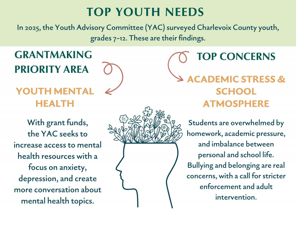 The latest needs assessment was offered to 7th through 12th graders in Spring 2025. Over 600 students responded to the survey, sharing their top concerns and positive influences in their daily lives and at school. The results indicated a grantmaking priority area of youth mental health and top concerns around academic stress and school atmosphere. The YAC will priortize grant funds that impact work done in those areas. In addition to top concerns, youth also shared the positive influences in their lives and ideas to increase those influences.