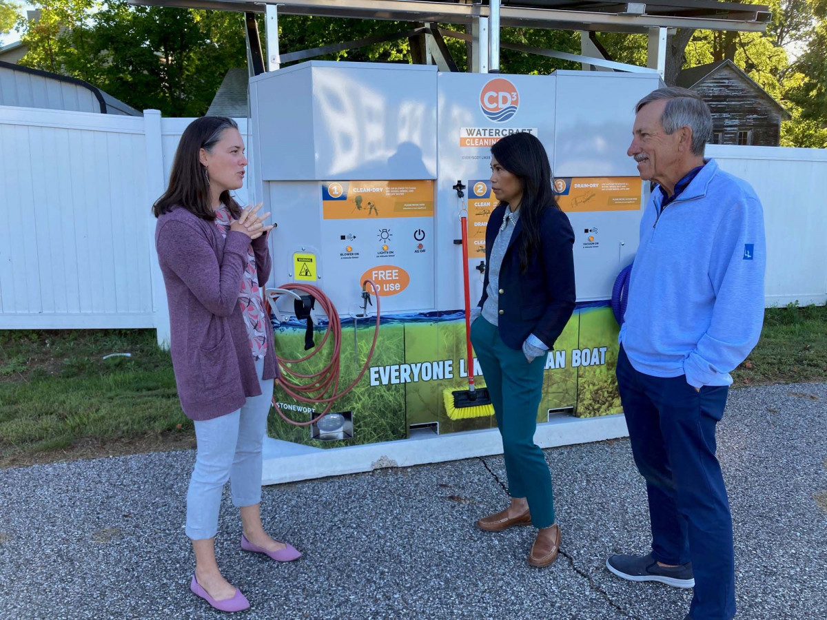 Did you know? There is a new law requiring boaters to clean, drain, and dry their boats after exiting a body of water in Michigan, and before entering another body of water. This new law is intended to help stop the spread of invasive species in our beautiful lakes and rivers. Currently, one local organization is leading the pack in providing a practical way to comply with this new law. Thanks to an Environment & Land Use grant from C3F, Walloon Lake Association and Conservancy has installed solar boat washing stations at 4 of the 6 boat launches on Walloon Lake. Their larger goal is to have a boat wash station at all 6 of the launches, so they are well on their way, thanks to support from grants, the community, and collaboration with local townships. Right now, the only invasive present in Walloon Lake is Eurasian milfoil, and according to board chair, Russ Kittleson and former Executive Director, Josephine Roberts, (pictured with C3F Staffer, Ashley Cousens) they did not see an increase in that plant this year, a credit to the over 2,500 uses of the new boat wash stations around the lake. Each boat wash station includes a brush, vacuum, blower, and other tools to help boaters remove plants and water from their boats when they are ready to leave the lake. In this way, one small action from boaters can help to make a big ripple effect in protecting our beautiful natural resources.